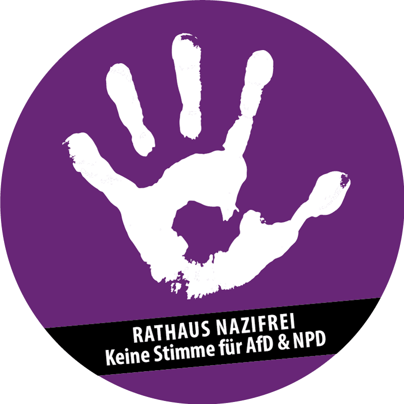 Wir würden uns freuen, wenn ihr euch dieser Kampagne anschließen könntet und wir beispielsweise als Zeichen der Unterstützung auf unseren Webseiten das obige Logo, das auch in vielen anderen Farben zu haben ist, nutzen sowie Buttons, Aufkleber oder Plakate mit verbreiten könnten. Durch eine erfolgreiche Kampagne in allen Bevölkerungsschichten hoffen wir die Kommunalwahl am 13. September 2020 günstig beeinflussen zu können, so dass das Rathaus wieder nazifrei ist! Keine Stimme für AFD & NPD.